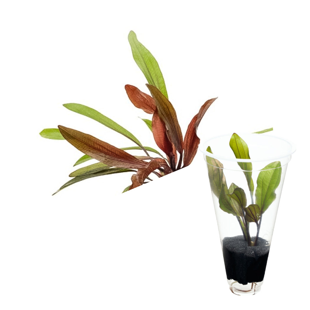 Echinodorus ‘Red Rubin’ Narrow Leaf is a compact and visually striking sword plant cultivar, also known as E. ‘Rubin var. lancifolius’. Unlike the larger, broad-leaved Echinodorus ‘Rubin’, this variety features slender, lance-shaped leaves that display vibrant ruby-red tones on younger leaves, gradually shifting to brown-olive hues as they mature. Underwater, it forms a rosette of curved, elongated leaves, typically 2–2.5 cm wide, reaching a height of 20–35 cm.