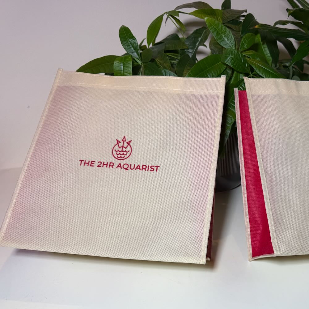 2Hr Aquarist Swag Bag Re-usable shopping bag made from Recyclable non woven PP, includes bottom liner Size Opens to 28.5cm (length) x 11.5cm (Depth)x 29.5cm (height).