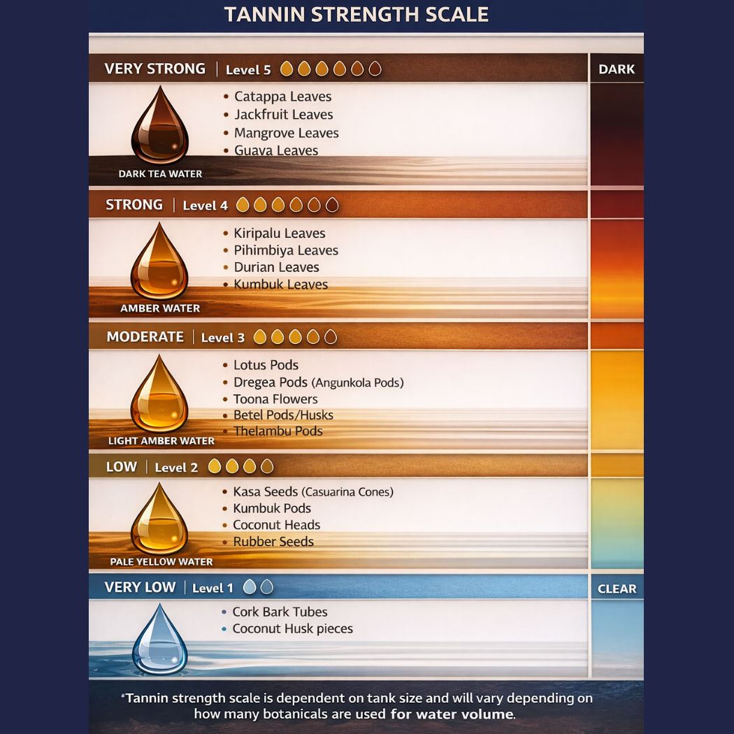 The Kumbuk tree (Terminalia arjuna) naturally grows along riverbanks in Sri Lanka and South Asia. In the wild, its bark and leaves regularly fall into the water, helping shape the natural blackwater habitats where many shrimp and tropical fish species evolved.