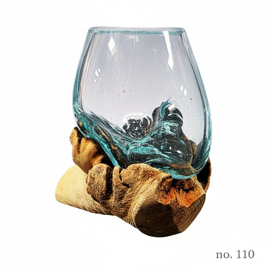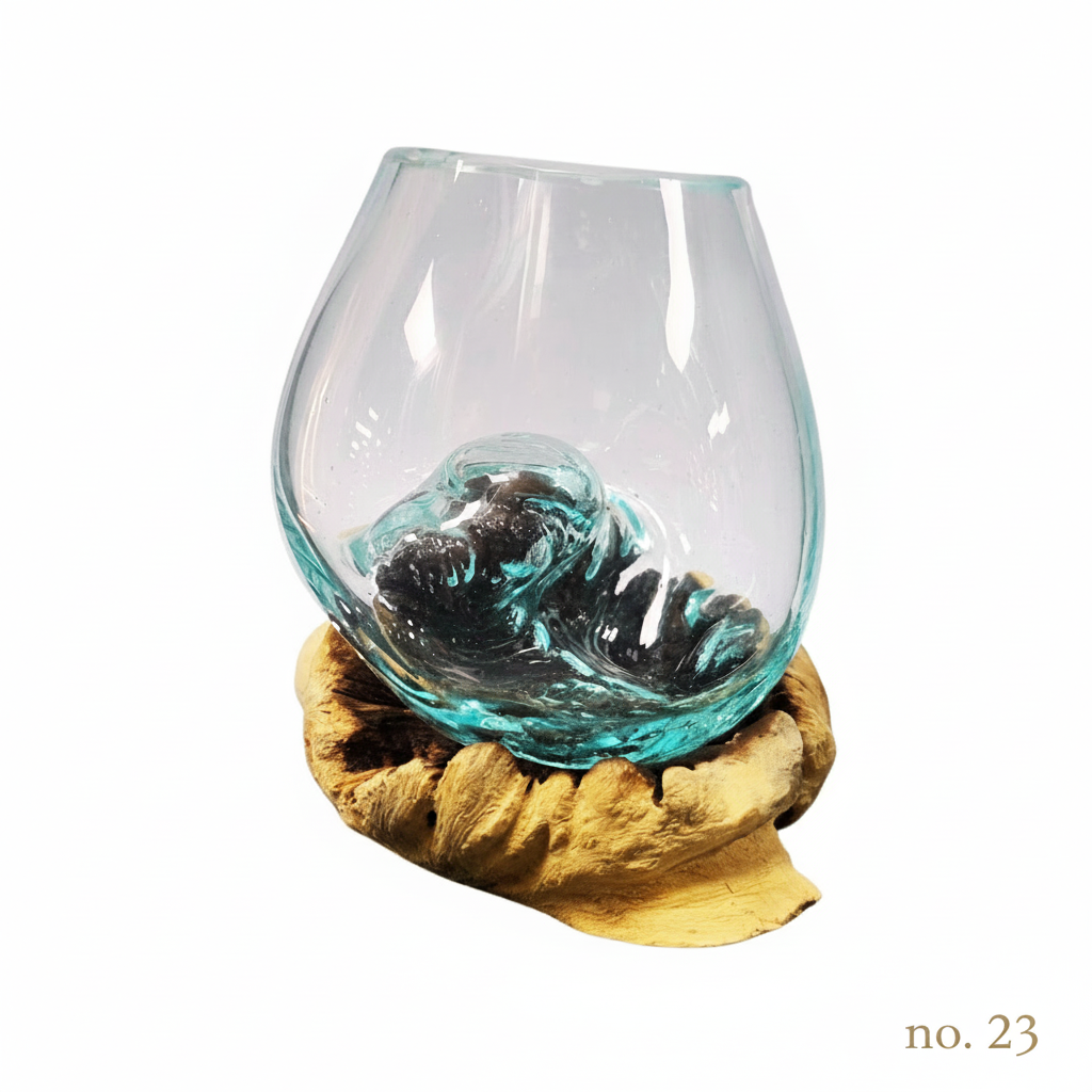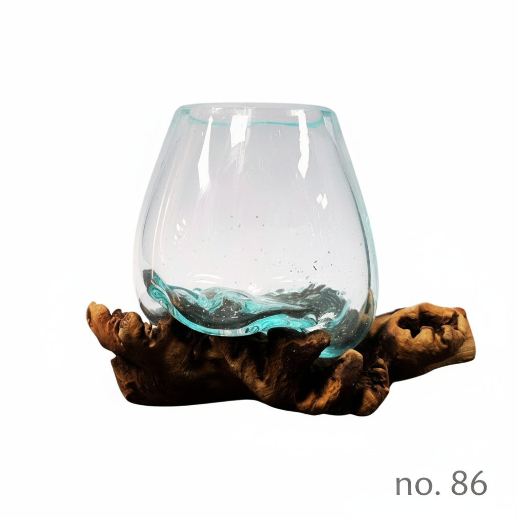 This molten glass terrarium is individually hand-blown to rare Balinese Parasite wood creating a one-of-a-kind piece, allowing the hot glass to contour perfectly to the wood’s shape. The result is a sculptural vessel with a fluid, artisan look, designed for modern terrariums, botanical styling, and living decor. Its natural asymmetry makes it a standout centrepiece in any space. Ideal for mossariums, miniature scapes, small plants, and living art displays.
