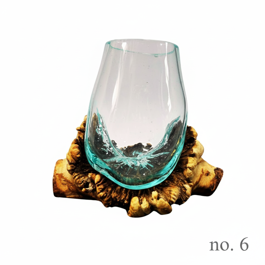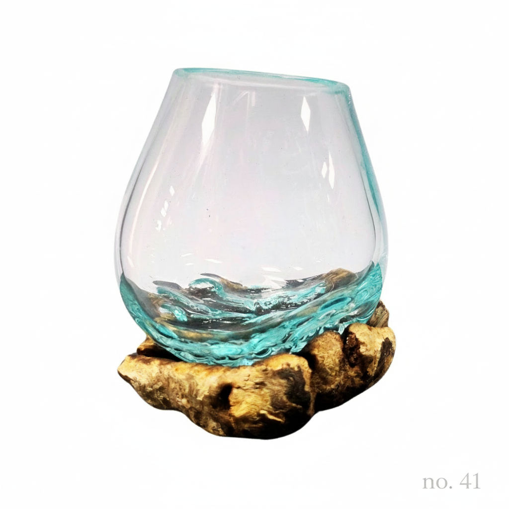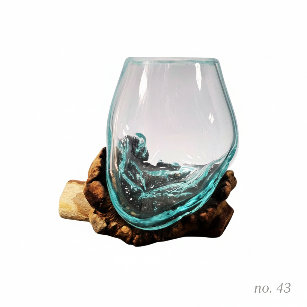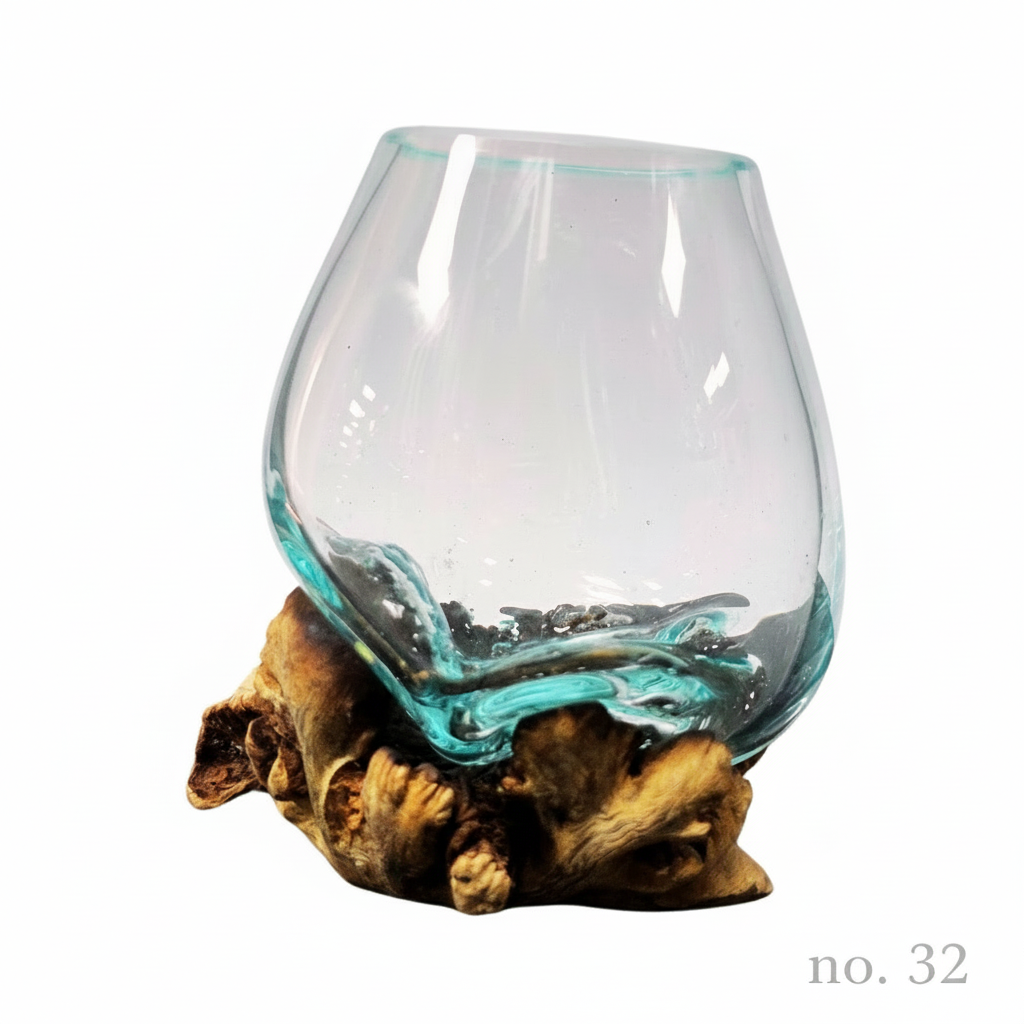 This molten glass terrarium is individually hand-blown to rare Balinese Parasite wood creating a one-of-a-kind piece, allowing the hot glass to contour perfectly to the wood’s shape. The result is a sculptural vessel with a fluid, artisan look, designed for modern terrariums, botanical styling, and living decor. Its natural asymmetry makes it a standout centrepiece in any space. Ideal for mossariums, miniature scapes, small plants, and living art displays.