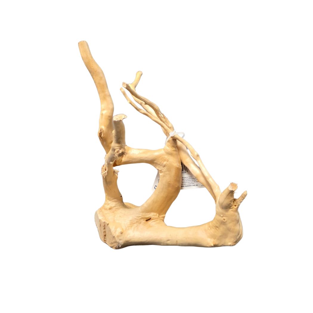 Once submerged, the wood darkens over time for a more natural look. A harmless white biofilm may appear early on—just brush it off or siphon it away. This will stop as the tank matures. Clean-up crew like Amano shrimp or Otocinclus will also help keep it under control.